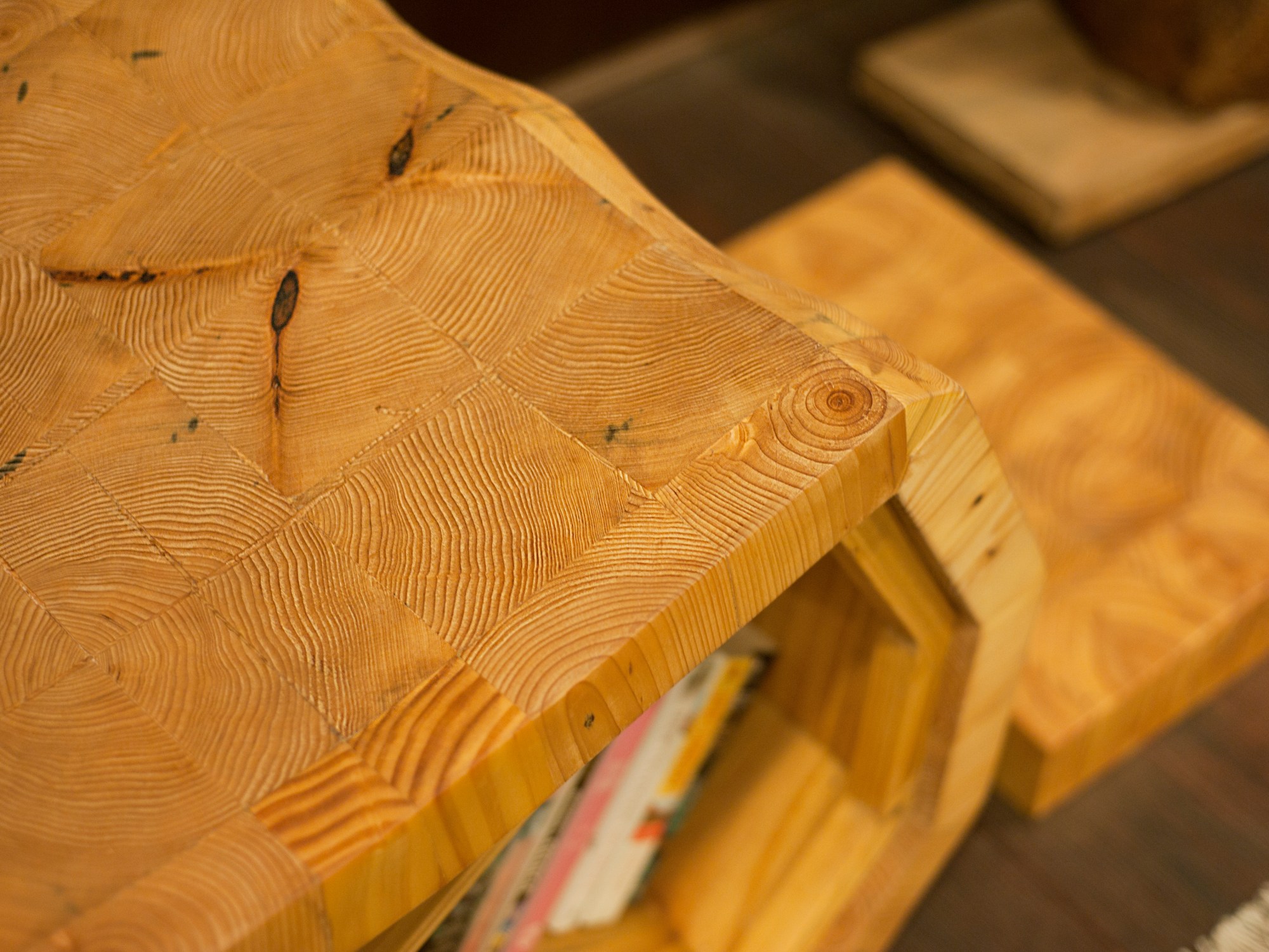 The chair has been created entirely out of reclaimed pine wood. For a interesting texture the pine endgrain was used for the entire surface of the chair. On either side are voids equipped with angular shelving to easily place books and magazines of varying sizes. For a comfortable posture while reading. An end grain foot stool is also provided with scooped out feet impression for a comfortable feel. The back and seat are has been carved out to cradle the body while one sinks into their favorite book.