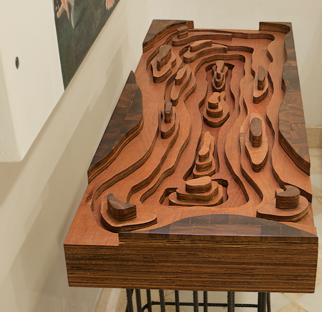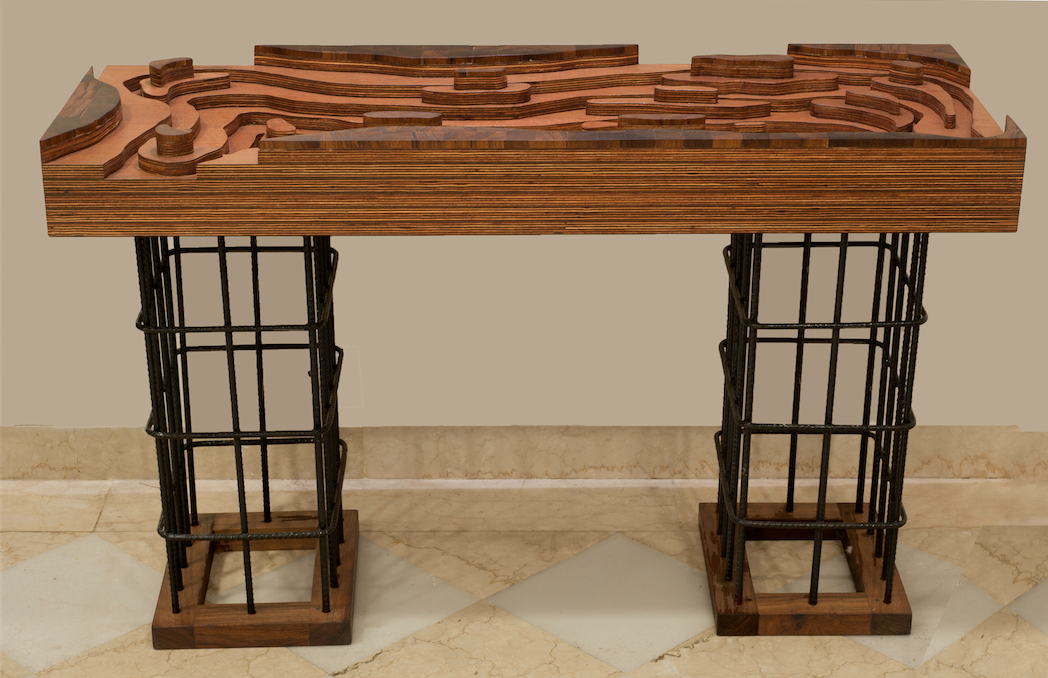 The rebar console table was inspired by the metal structures created to make columns in the foundation of buildings. The two rebar structures places on a thick base of solid teak support the topographic layered table top. The hills and valleys of the counter can be see through a 12mm thick glass piece. The top most layer of the table top is created by placing pieces of teak end grain for an elegant finish.