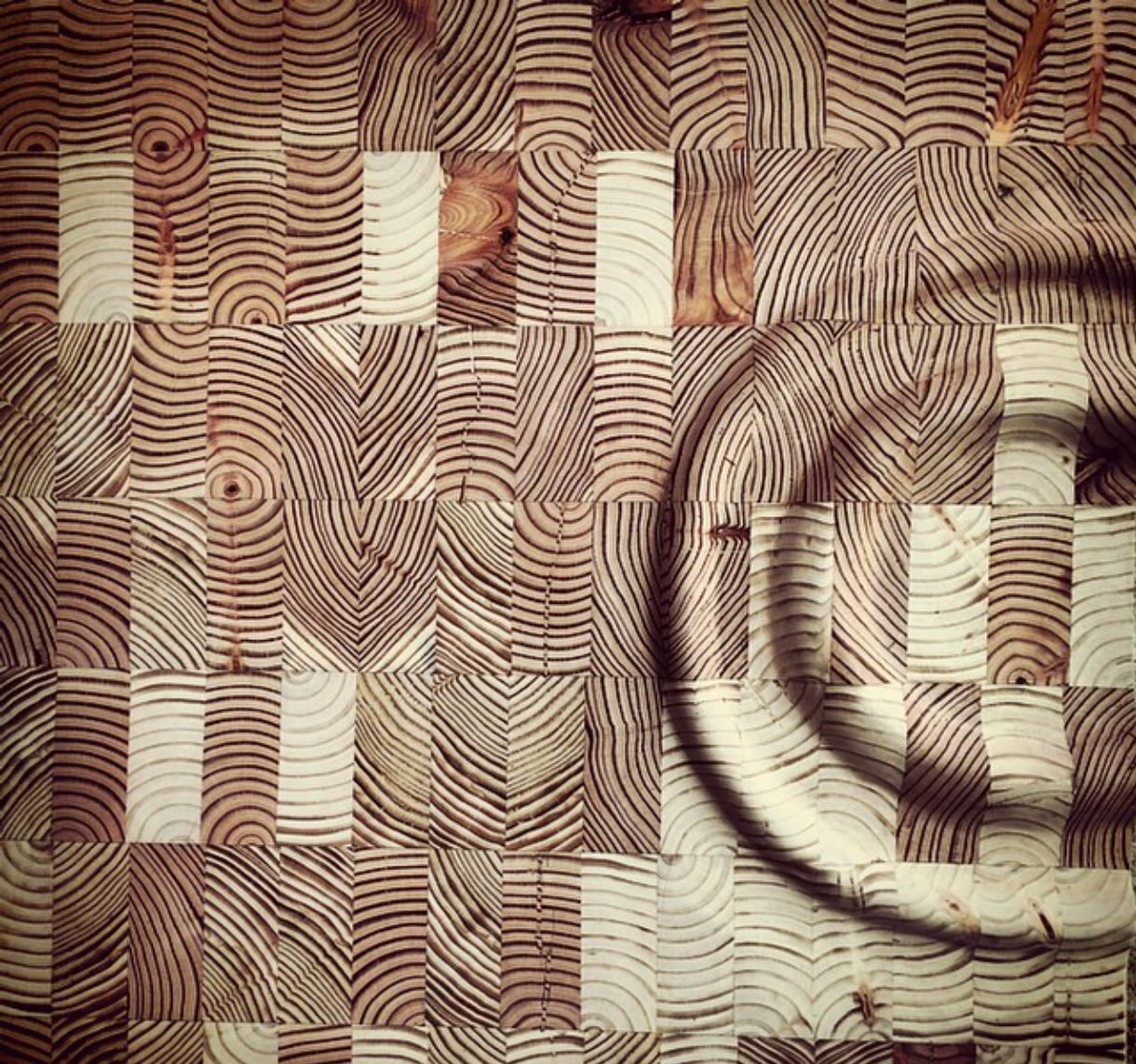 The end grain reclaimed pine coffee table has a vivid story to tell. The pixelated look of the table top has been created by using reclaimed end grain pine wood while strategically merging the different natural colors of the wood to created an effect of dark with light. The ripple had been carved out the table to give an illusion of water that one can actually feel. The four legs have been created by extending some of the pieces down in a staggered manner to support the entire structure.