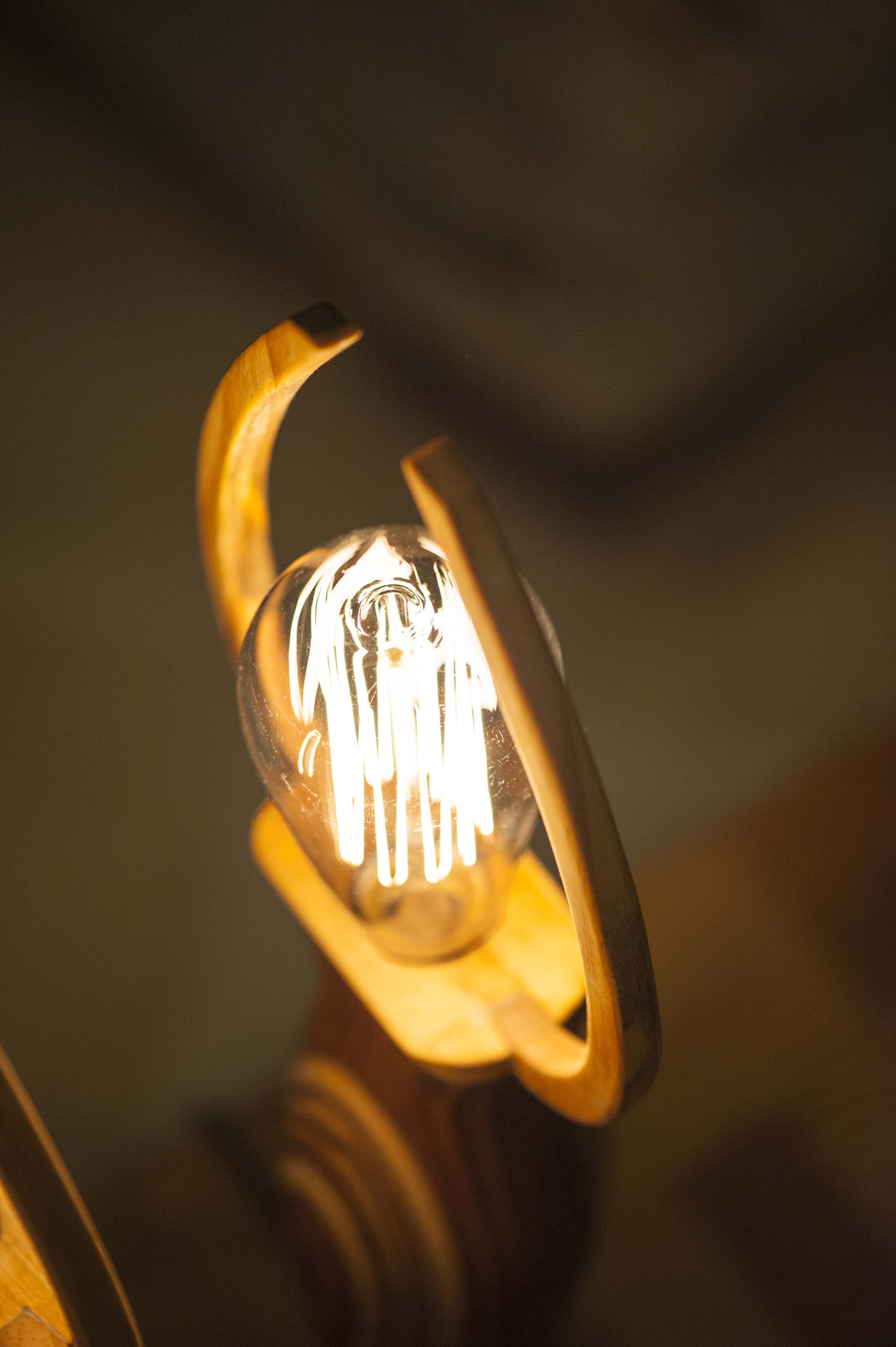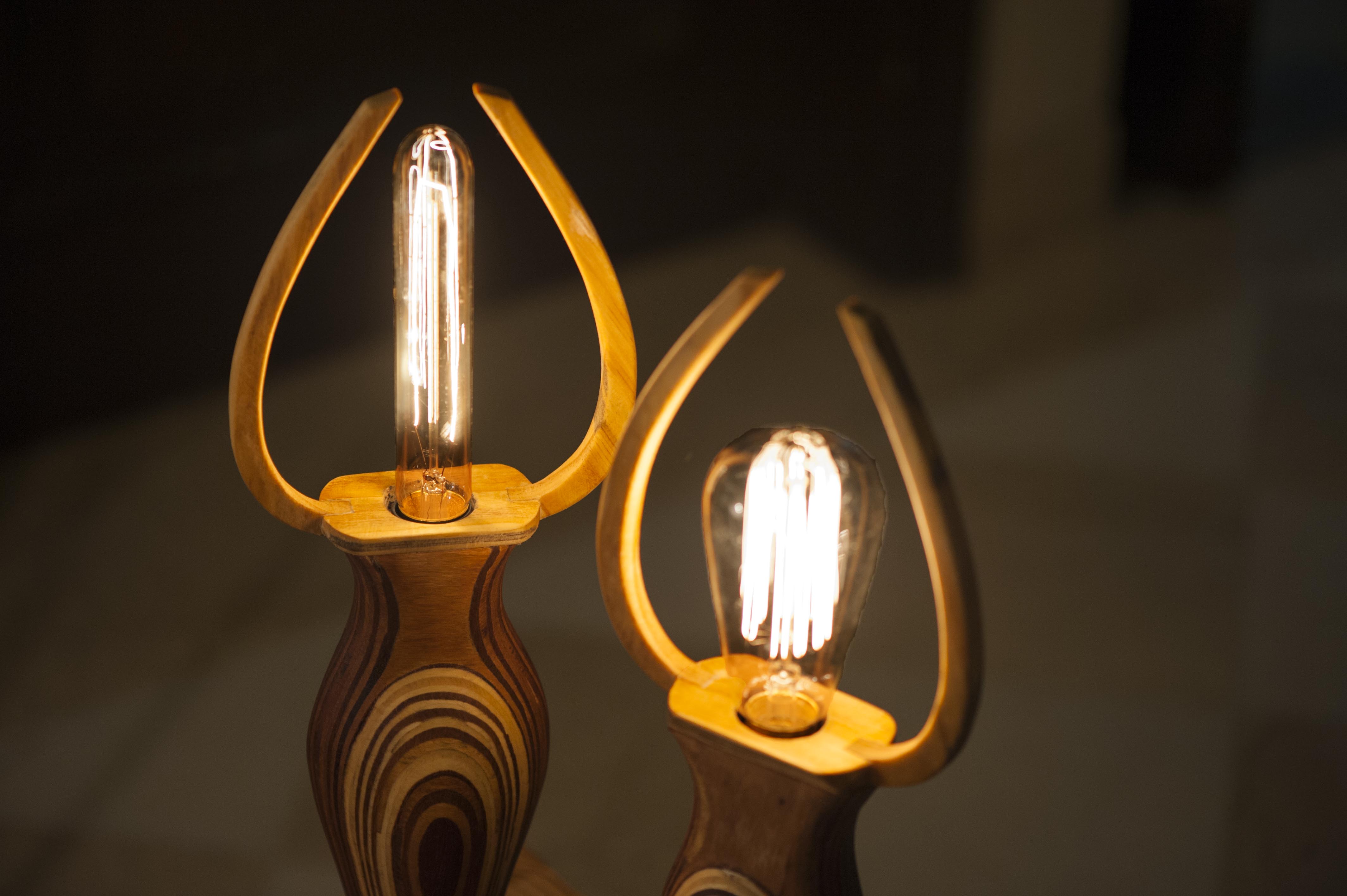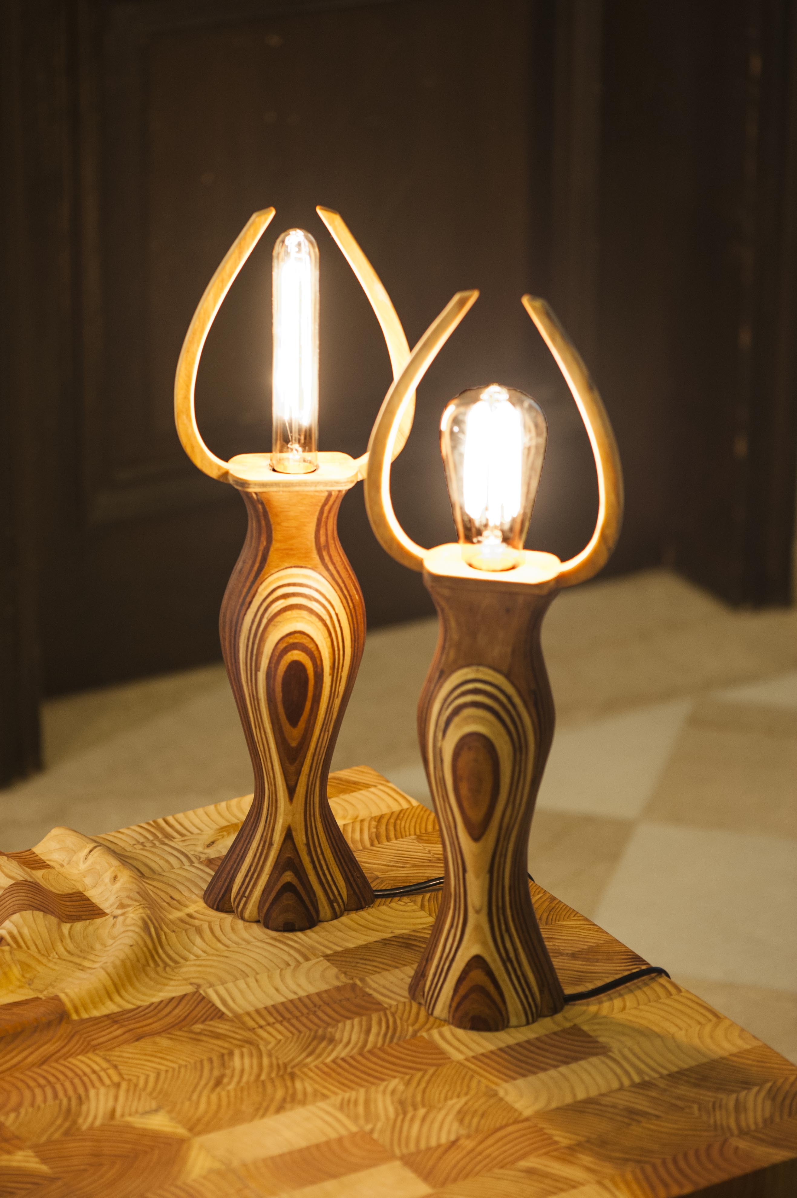 These lamps have been created by layering plywood and carving out a traditional silhouette from a not so traditional material. The shade of this lamp is hinted by the reclaimed wood flame that frames the exposed filament bulb creating a candle like structure.