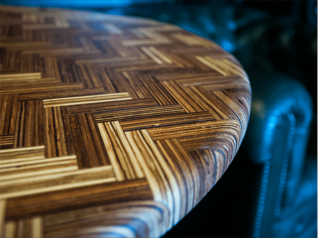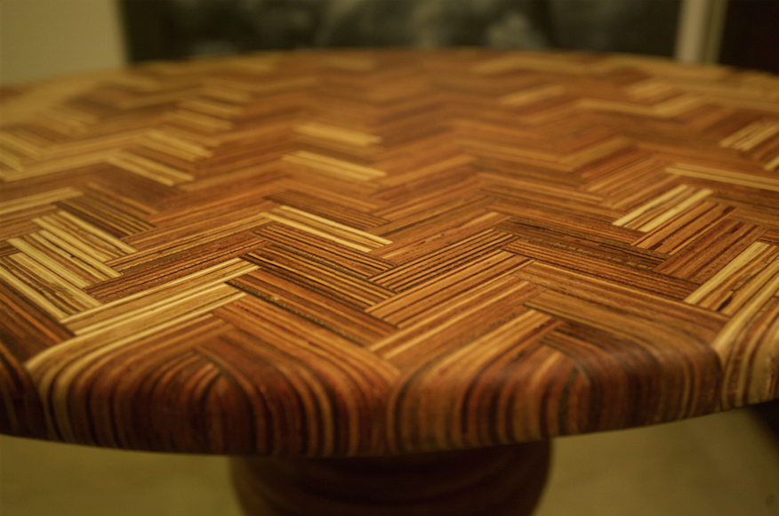 Hundreds on pieces of layers Saal wood hand crafted into a melange of dark and light pixels to reveal a herringbone table top set onto a layered circular tripod base with staggered pixelated legs.